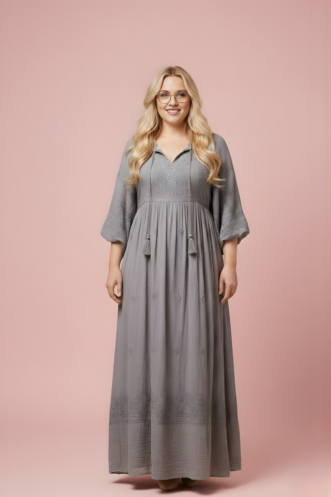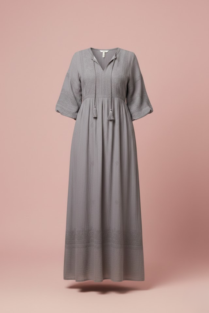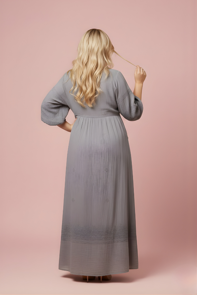 L’encolure délicate, les manches souples et les finitions discrètes soulignent une silhouette naturelle, sans contrainte. Chaque détail de la robe TERRA a été imaginé pour durer, loin des tendances éphémères, dans une démarche de mode responsable et consciente.